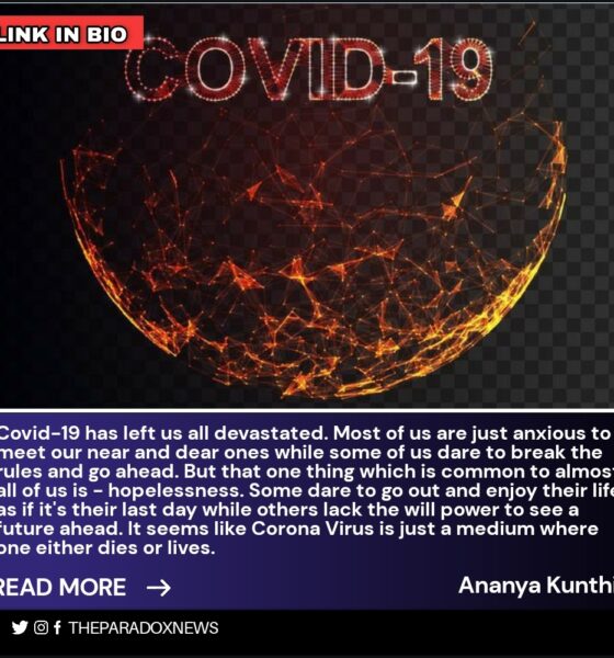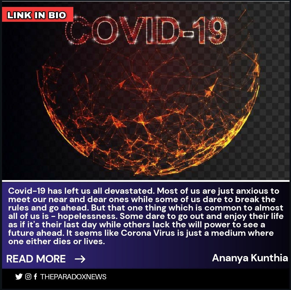 Covid-19 has left us all devastated. Most of us are just anxious to meet our near and dear ones while some of us dare to break the rules and go ahead. But that one thing which is common to almost all of us is – hopelessness. Some dare to go out and enjoy their life as if it’s their last day while others lack the will power to see a future ahead. It seems like Corona Virus is just a medium where one either dies or lives. There is no in-between. While our lack of will power to live on is itself poisonous. People who lost their lives due to COVID-19 will be remembered as warriors who lost their battle of life. But people losing their will power to live will be considered as losers who did quit the game of life without really playing it well. What example are we going to set for the generations ahead? Let’s question ourselves and find a way out of these depressing vibes.