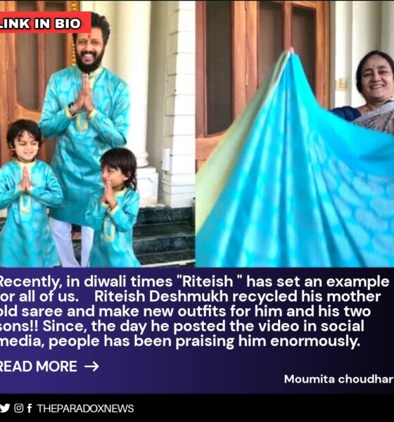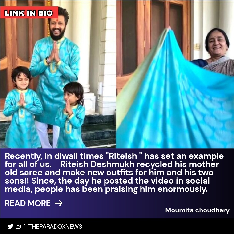 Recently, in diwali times “Riteish ” has set an example for all of us. Riteish Deshmukh recycled his mother old saree and make new outfits for him and his two sons!! Since, the day he posted the video in social media, people has been praising him enormously. Riteish has celebrated diwali in unique way, instead of buying new clothes, the actor recycled his mother’s old saree to make kurtas. Really, Riteish made a statement in this diwali. Recycling old sarees is not just the only thing, but old sarees passed on from generation to generation. And, when it is mother’s old saree, then it is not just the simple saree, the saree too old many emotions. It would be great if everyone revive the old sarees in a fashionable manner. Despite of being a famous celebrity , Ritesh does proved that one can’t just let go the mothers old saree and the way he reused his mother’s old saree by recycling it for him and his two kids, is really admirable. His post is winning hearts all over the internet!nning