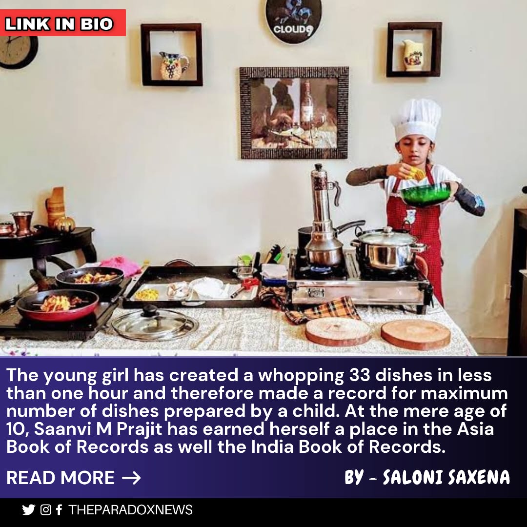 Saanvi M Prajit, daughter of Wing Commander of Indian Air Force Prajit Babu and Manjma hailing from Ernakulam and is currently settled in Visakhapatnam with her family, cooked 33 dishes just in 60 minutes and bagged a place in the Asian Book of Records for the maximum number of dishes prepared by a child.