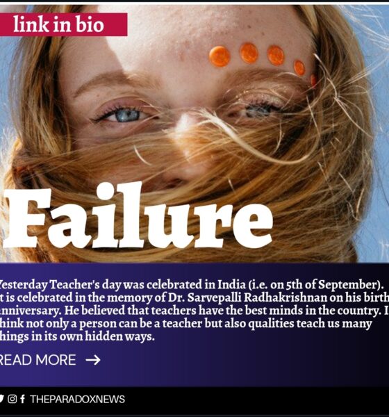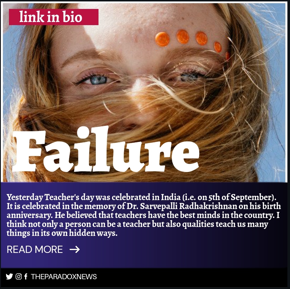 Yesterday Teacher’s day was celebrated in India (i.e. on 5th of September). It is celebrated in the memory of Dr. Sarvepalli Radhakrishnan on his birth anniversary. He believed that teachers have the best minds in the country. I think not only a person can be a teacher but also qualities teach us many things in its own hidden ways. I have had many great teachers, their knowledge was restricted to only their subject but failure taught me lessons in every walk of life. I believe noone taught me as much as failure did. Failure is and always will be my greatest and wisest guru.